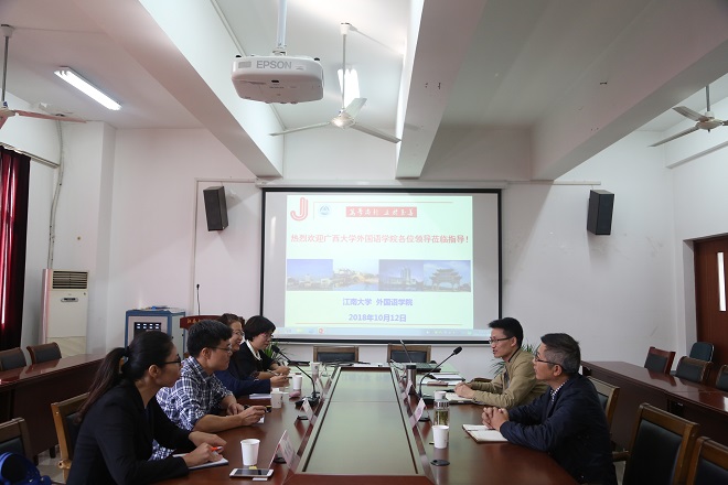 2018年10月12日,广西大学开云手机登录入口一行4人在常务副院长关熔珍教授的带领下来我院调研专业人才培养、学科建设、研究生培养与实验室建设等工作。我院朱义华副院长和英语系主任孙志祥教授以及研究生秘书王莉莉老师接待了远道而来的客人,并就相关问题进行了深入的交流。