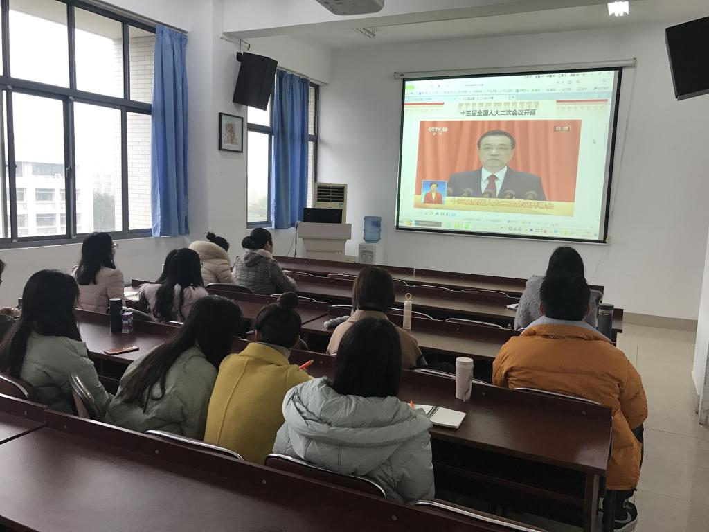 2019年3月5日上午,十三届全国人大二次会议在北京隆重召开。为引导学生关注两会召开盛况,增强学生社会意识,开云手机登录入口组织各学生党支部学生党员在学院A433集体收看两会直播视频。学院分团委辅导员老师黄颖、张圆也和同学们一起收看直播,学习两会精神。