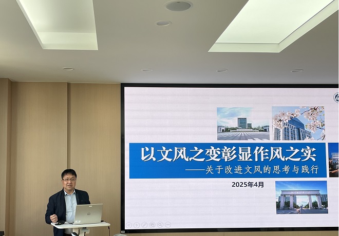 随后,学院党委副书记、副院长季王飞以《以文风之变彰显作风之实——关于改进文风的思考与践行》为题讲党课。他从“为什么要改进文风”“需要什么样的文风”“如何改进文风”的角度出发,阐释了切实改进文风的基本要求与内涵。他还结合自身工作经验,分享了新闻稿撰写的规范性、实际写作过程中的常见问题和注意事项,摈弃“长空假”,提倡“短实新”,为学院在实际工作中落实改进文风提供了具体指导。