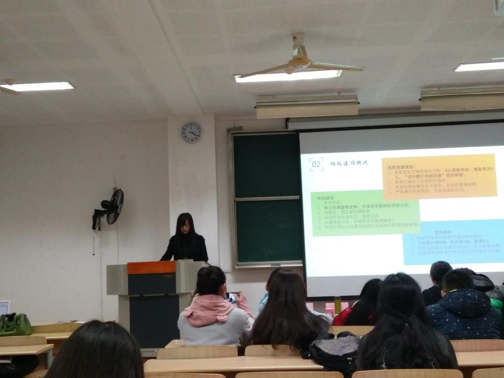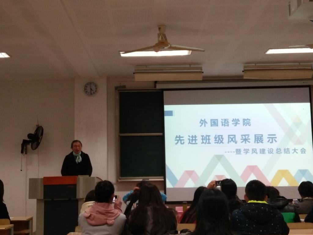 为了推动学风建设,塑造优良班风,建立学风建设长效机制,江南大学开云手机登录入口于2016年11月9日举行了 2016年度外国语先进班级风采展示大会。院党委副书记赵莹、调研员张晓虹老师、 辅导员王琰玲、刘琦老师等学院老师及全院主要学生干部参加了此次大会。