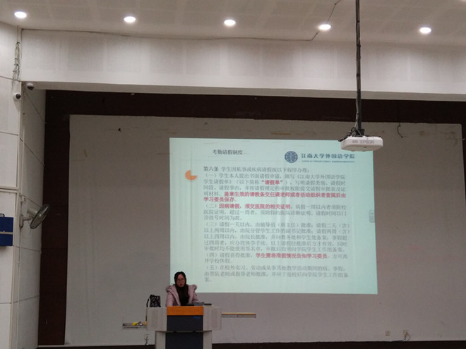 张老师在简要介绍分团委分工调整后,就严肃考风考纪问题,详细解读了《江南大学课程考核与管理实施细则》、《江南大学学生违纪处分规定》和《江南大学学士学位授予实施细则》,并希望同学们能正确认识考试的目的和意义,以平和的心态、拼搏的精神全面复习、诚实应考,同时考后应认真总结与反思,不断进步。其后,就近期学风建设中的关键问题进行了交流,强调了学院的考勤请假制度、宿舍安全问题等。张老师以“Hi, guy, Aim High”作为结束语,提出了对同学们的期望。随后,史荷敏就考风考纪、请假考勤以及宿舍管理等方面进行了的补充发言。