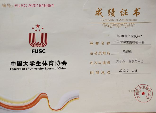2019年8月,第28届“应氏杯”全国大学生围棋锦标赛在大连理工大学举行,开云手机登录入口英语1802班陈颖璐同学代表江南大学参加了本次比赛,并在比赛中取得了女子组第六名的好成绩。