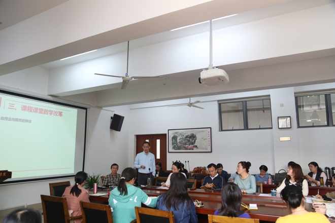 龚院长指出改革应立足师生双主(教师为主导,学生为主体),以学生发展为中心,引导学生主动学习,提高学习效率和自主学习能力。在课堂上,教师的角色要实现从授业向解惑的转变、教学方法应实现由演绎向归纳的转变、教学内容要实现由扁平向纵深的转变。同时,大外的教师团队组织形式也可借鉴英语专业的实践模式,实施轮换制,即每个教学班级配备不同学科背景的师资力量轮流承担部分教学任务,最大程度共享优质教学资源。在条件许可下,甚至可以和国际教育学院等部门合作,充分利用外教和留学生资源,尝试中外教师合作教学。在谈及听力、阅读等输入型课程教学方式改革时,提出了零课时教学模式,倡导通过泛在化教学,引导学生通过自主学习,完成规定量的学习内容。最后,龚院长总结说改革的最终目的是要让学生忙起来,要让学生有的放矢地学习,改革应以点及面推开,是理念的更新,更是实践的自然选择。最后,龚院长对本学期各课程的考核模式提出了指导性建议。