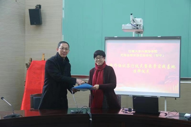 龚晓斌院长在答谢辞中对无锡金桥教育集团支持我院外语人才培养表示了感谢,并介绍了学院的办学情况与人才培养状况。针对以往超过50%的研究生选择从事外语教学的就业趋势,为加强人才培养的针对性,学院利用修订人才培养计划的契机增加了外语教学理论与实践方面的课程,这些课程的开设将依托本院师资与像金桥初中这样优秀的教学实践基地及其师资,加强教学的针对性与适用性。龚院长同时强调,除教学实践合作外,双方还将开展教师间的互动交流,探讨新的教学法,谋求双方共同发展。