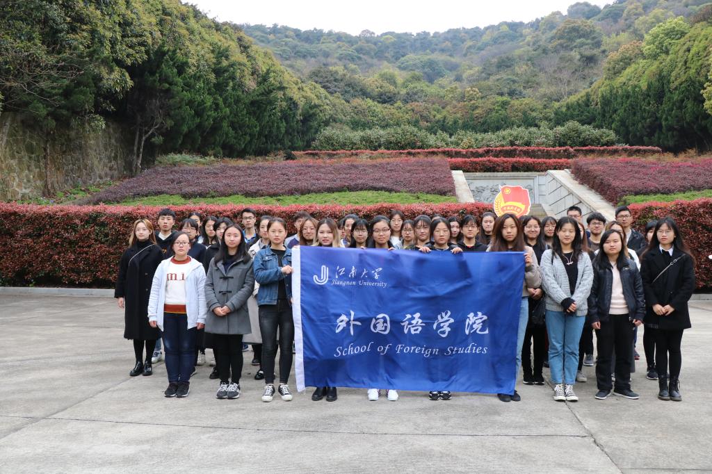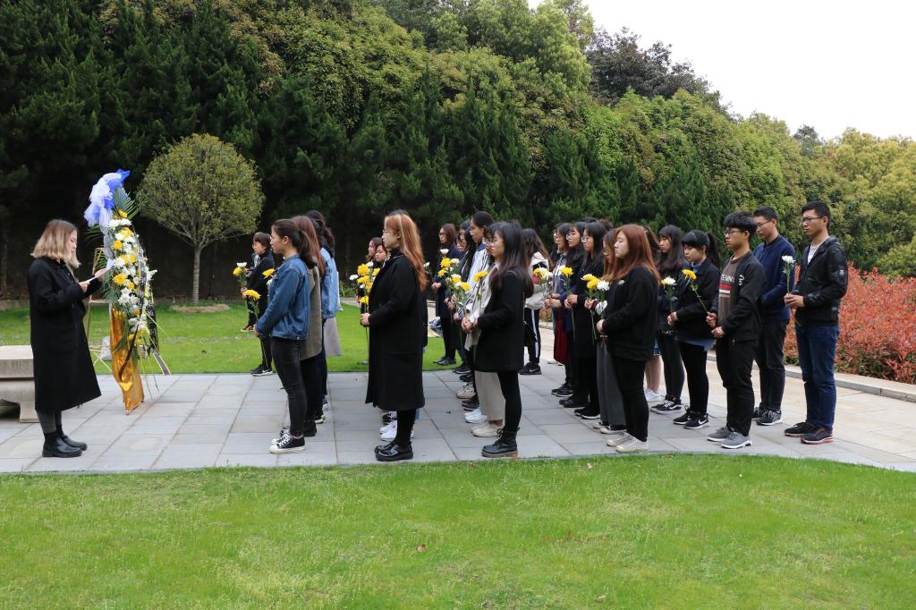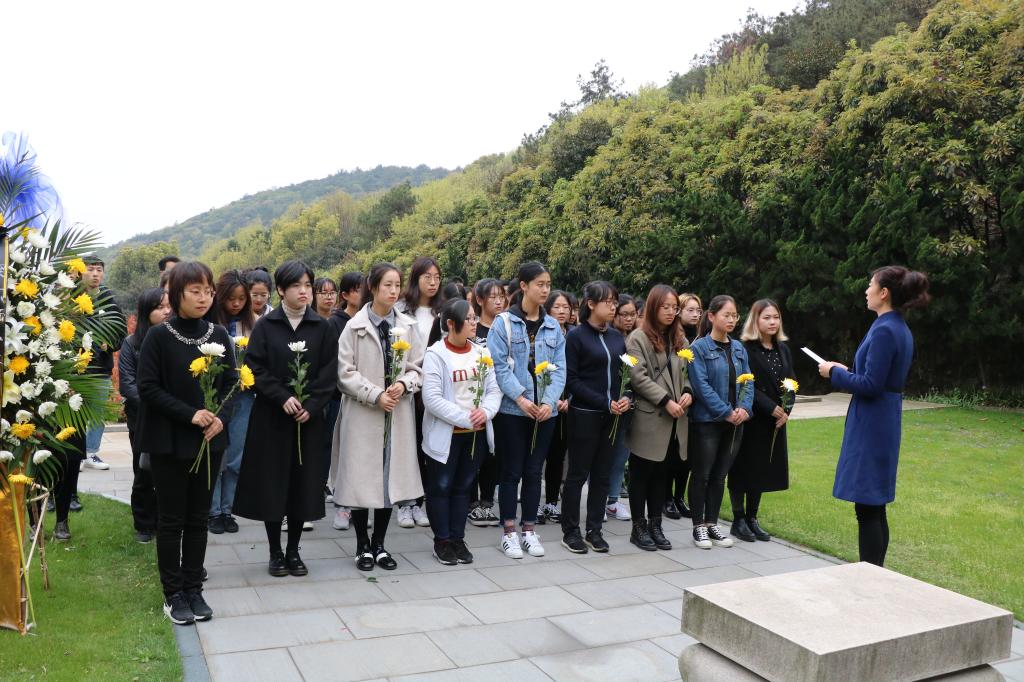 祭扫仪式由窦新华副处长主持。窦老师向大家介绍了荣副主席的生平事迹及荣氏家族对江南大学的支持和捐赠。荣副主席生前热爱祖国,心系家乡,心系教育事业,同时不忘支持江南大学发展。随后,由学生代表庄重地向陵墓敬献了花篮。英语1705班的蔡艳娟同学作为学生代表诵读祭文,表达了对荣副主席的高风亮节、丰功伟绩、家国情结以及其崇高品格的追思与敬重,并表示我们应刻苦钻研,自觉将自己的命运同国家的命运紧密结合在一起。活动最后,参加祭扫的同学和老师们向陵墓鞠躬并静默哀思三分钟,结束后绕墓地一周并献上鲜花,表达对荣副主席及夫人的深切哀悼和敬仰。