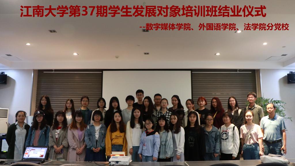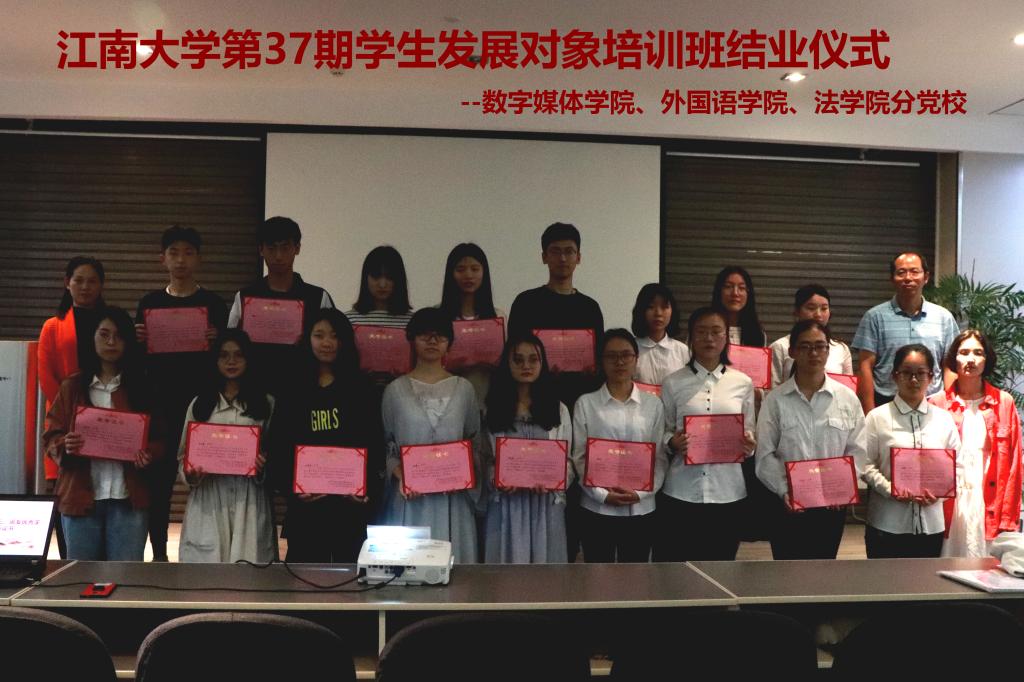 2019年5月15日下午,江南大学第37期发展对象培训班开云手机登录入口、数媒学院、法学院分党校结业仪式在数媒学院116报告厅顺利举行。学院党委副书记副院长刘伯贤、分团委书记杨艳出席结业仪式。