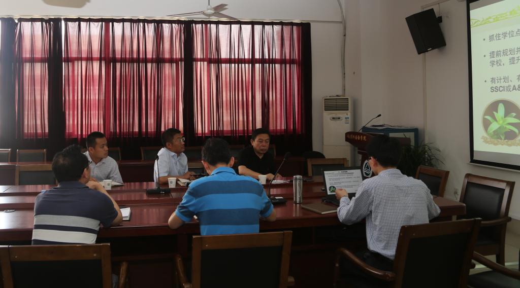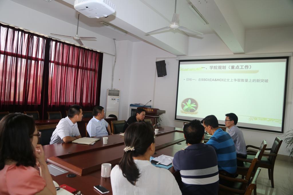 首先学院分管科研工作的副院长朱义华老师从学院规划、科研管理、智库建议与困难和诉求四个方面进行了汇报,随后龚院长对学院科研工作的发展思路、基地建设、人才短缺与“分压”发展等方面进行了补充说明。陈副校长、刘处长根据开云手机登录入口师资队伍现状、青年博士引进与课题奖项申报等方面的难点进行了一一分析与解答,并提出了具体的建议与应对策略。