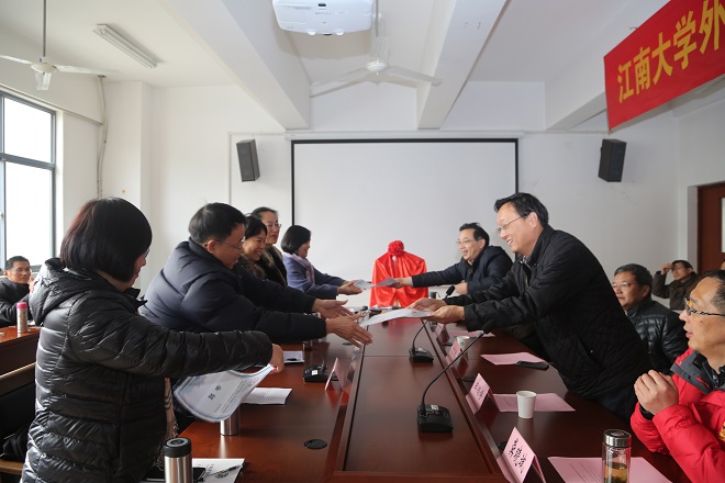 会上,领导向五位教学督导颁发了聘书,纪志成副校长与龚晓斌院长共同为“江南大学开云手机登录入口教师卓越分中心”揭牌。