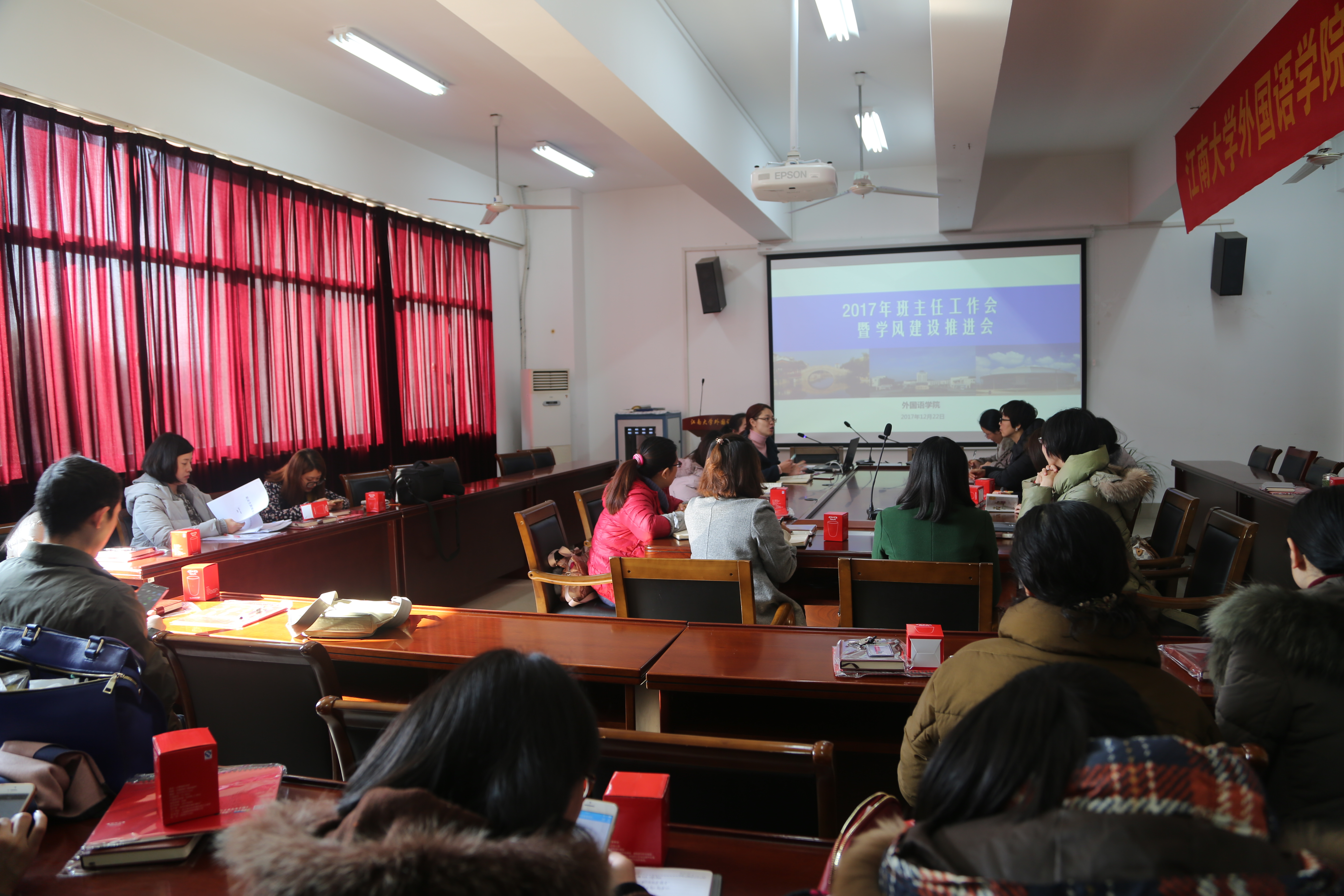 本次会议共分为三个部分。第一部分为年度优秀班主任评选结果通报。2017年度陈昀等九位班主任被评为学院优秀班主任,邢嘉锋等三位班主任被推荐评选校级优秀班主任。第二部分为工作回顾,杨艳老师首先对学工组成员的岗位职责进行介绍,随后进行工作通报。2017年,在班级建设方面,我院开展了班级风采大赛等活动,极大地加强了班级文化建设以及凝聚力;在学风建设方面,我院出台了学风建设工作方案,并召开学风促进会,巩固完善了班风学风建设;在团支部建设方面,我院组织了丰富多彩的团支部活动,将理论落实于实践。在人才培养、学生党建、个体关爱等方面,我院皆取得了一定的成绩。此外,杨艳老师介绍了我院近期工作以及2018年的工作思路。本次会议的第三部分为优秀班主任工作经验交流,邢嘉锋、高松怡、王红军老师分别介绍了自己班主任工作中的一些经验和做法。会议最后,赵莹副书记总结讲话,她首先对各位班主任在过去一年中的辛勤付出表达了感谢,随后呼吁学工组成员与各位班主任应共同致力于让每一位外院学子实现自己的“江南梦”,使外院成为一个有关怀有温暖的大家庭。