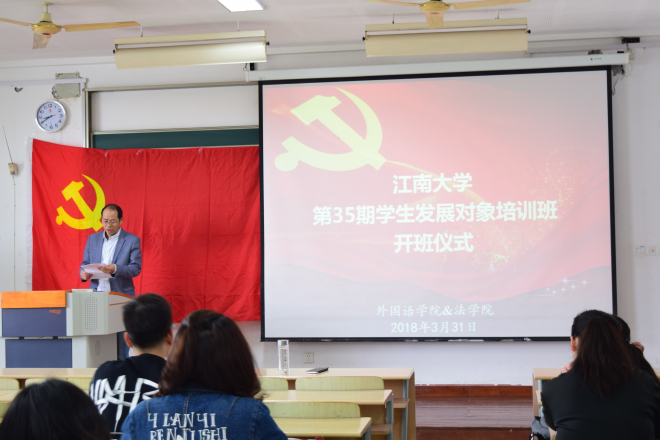 2018年3月31日上午8:30,江南大学第35期学生发展对象培训班开班仪式在2D102教室顺利召开,外国语学院党委副书记、副院长刘伯贤老师、开云手机登录入口分团委书记杨艳老师、马克思主义学院陈永杰老师出席了此次会议。本次会议由开云手机登录入口党委副书记刘伯贤老师主持,并邀请陈永杰老师为本期学生发展对象做了一场精彩的讲座。