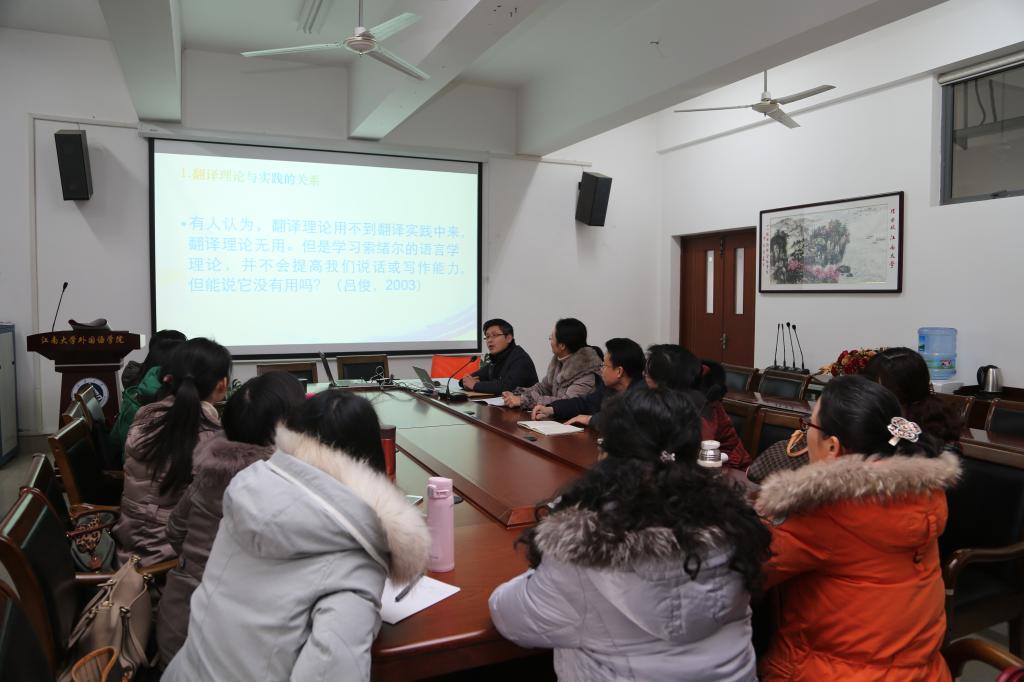 开云手机登录入口“卓越课堂”翻译模块互动式系列讲座第二场在拓展部翻译组教师们的期盼中于2016年1月12日下午在开云手机登录入口A349准时开讲了。主讲人为资深翻译教授孙志祥老师,讲座题目是《翻译理论在翻译教学中的应用》。
