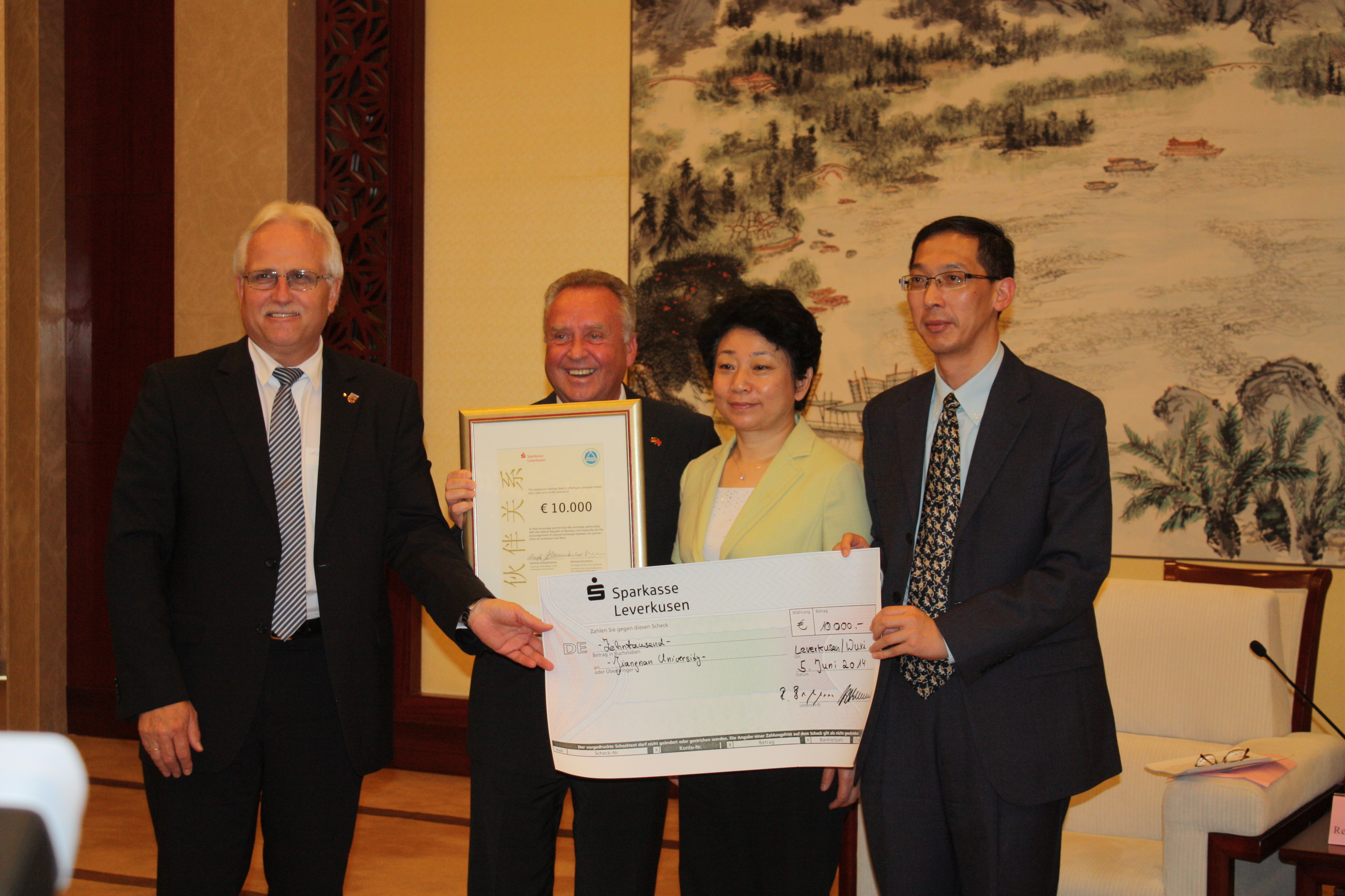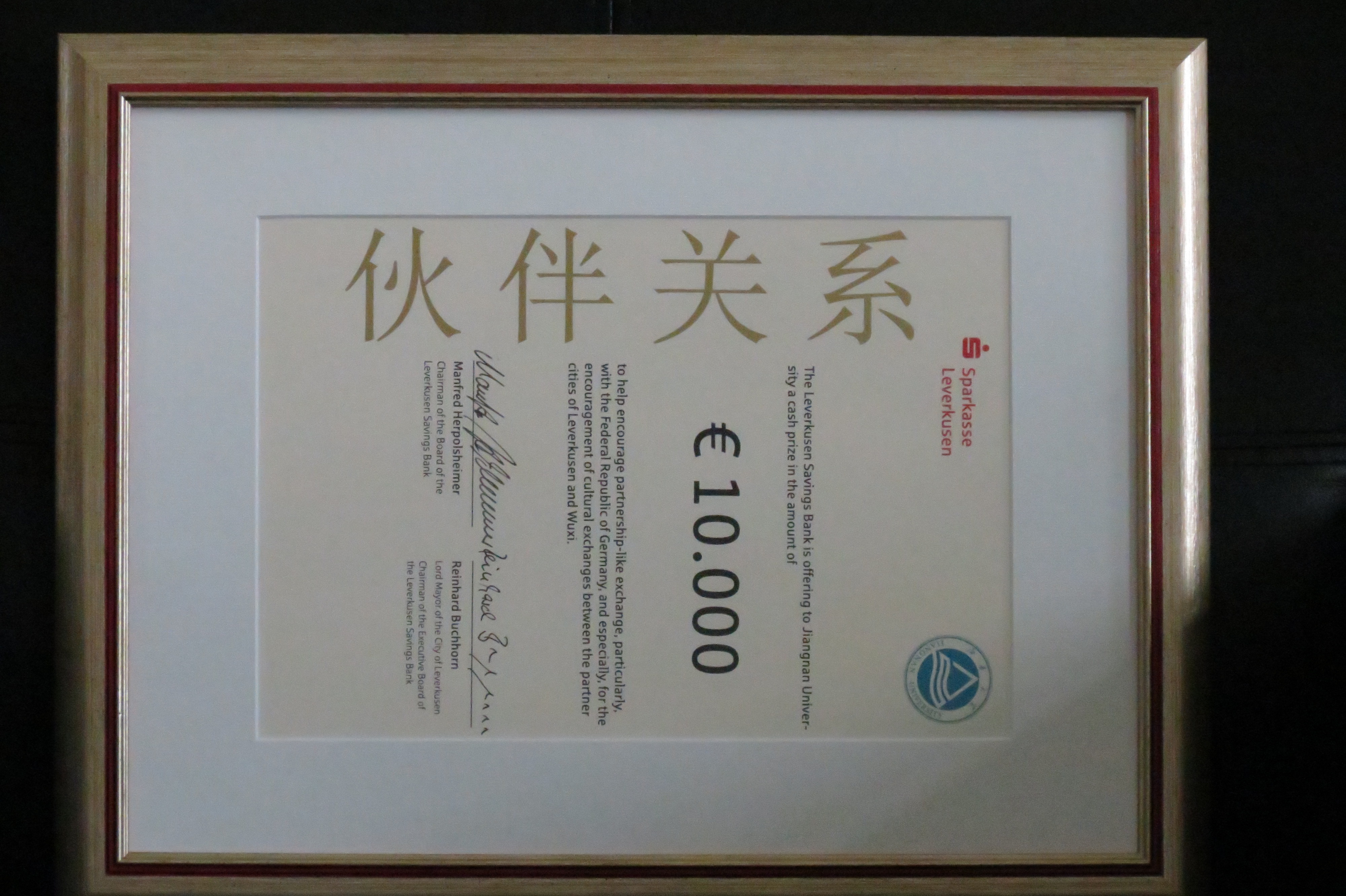 2014年6月5日,由市长莱茵哈德·博鸿(Reinhard Buchhorn)率领的德国勒沃库森市政府和企业家代表团一行到访无锡,与无锡市续签友城协议。省委常委、市委书记黄莉新、市领导张叶飞、嵇克俭在无锡市市民中心一号楼会见了德国客人。勒沃库森市代表团此次来锡访问,意在推进两市教育界的交流合作,促进两地企业之间的经贸往来。在友城协议续签仪式上,勒沃库森市代表团主要成员之一勒沃库森储蓄银行董事会主席首席执行官曼弗雷德·赫博斯海姆(Manfred Herpolsheimer)先生以个人名义向江南大学外语学院捐赠教育交流经费1万欧元,用于江南大学开云手机登录入口师生开展奖教助学与国际文化交流,特别是与德国之间的交流与合作。江南大学开云手机登录入口龚晓斌院长代表受捐方从曼弗雷德·赫博斯海姆手中接过了捐赠支票和“伙伴关系”证书。此次捐赠活动得到了朗盛(无锡)化工有限公司和我院德语教师邢爱华的大力支持,特此致谢。