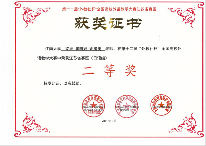 在刚刚结束的第十二届“外教社杯”全国高校外语教学大赛江苏省赛区的比赛中,我院日语教学团队荣获二等奖,这是日语教学团队首次在省级教学比赛中获得佳绩,为日语教学团队参与教学比赛取得突破进展。