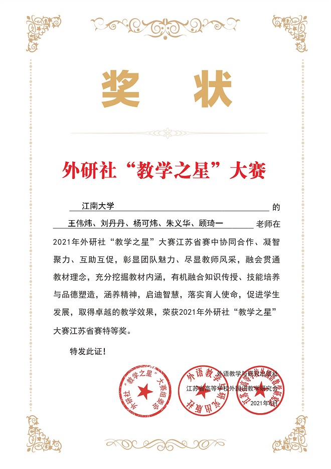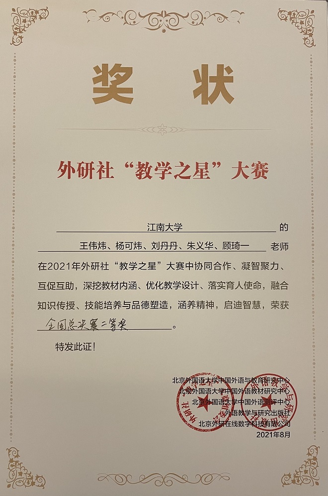 近日,2021年外研社“教学之星”大赛比赛圆满落幕。我院王伟炜、杨可炜两位教师代表“大学英语”课程教学团队(王伟炜、杨可炜、刘丹丹、朱义华、顾琦一),经过层层选拔,在获得江苏省特等奖后从全国395个大学英语团队中脱颖而出,取得了全国总决赛二等奖的好成绩,继2019年获“外教社杯”全国高校外语教学大赛三等奖后实现了我校在国家级外语教学大赛中新突破。