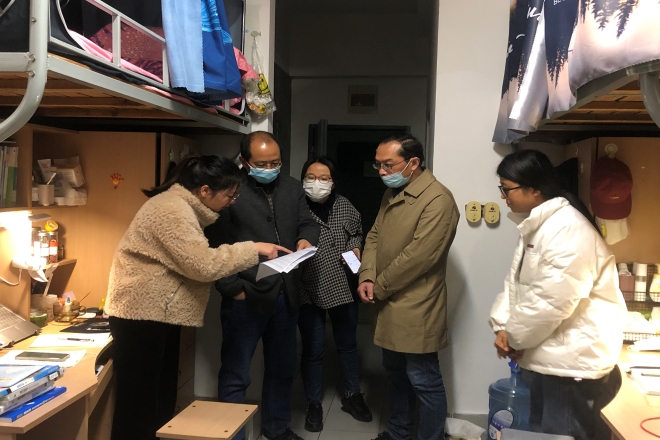 为了给返校的学生带去学院的关心,并及时了解学生的思想动态、学习生活情况,3月22日18:30,开云手机登录入口党委书记史志洪、院长方文开、党委副书记刘伯贤、副院长顾琦一、分团委书记陆芳以及辅导员老师一行来到浩苑、润苑公寓,走访关心我院返校学生。