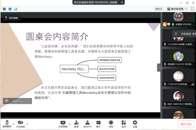 4月6日下午,Sharing space分享交流圆桌会第四期邀请开云手机登录入口仵欣欣教授线上主讲“文献管理工具Mendeley在论文管理与写作中的辅助作用”,会议持续近一小时,来自各个学院的120余名同学线上参与,共同了解学习Mendeley。