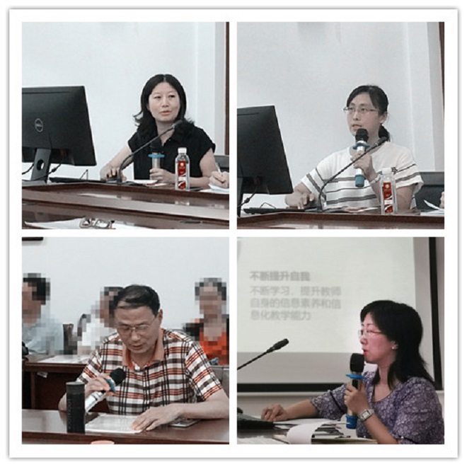 随后,教师们各抒己见,开展热烈的讨论。王伟炜老师分享了上学期开展全国大学英语课程思政示范课的经验,提出大学英语教师需提炼思政内容,有效设计教学活动;王筱娟老师从多年来潜心教学的经历出发,指出立德树人切实体现在教师言传身教和真心关爱学生的点点滴滴;仇黎霞老师介绍了基础英语课程组在每单元中融入思政元素的方法与途径;杨可炜老师描述了《听说(2)》课程如何将思政点融入学习内容的实例;许敏老师从务实创新的角度,讲述了教学资源素材收集中的思政关注点问题;辛洁敏老师分享了爱岗敬业就要保持工作热情并以这种热情感染学生、激发学习积极性的切身感受。