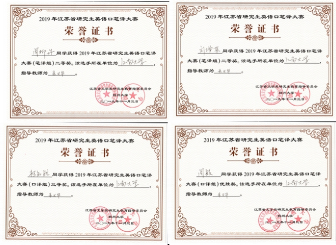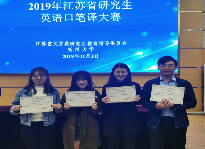 2019年江苏省研究生英语口笔译大赛于2019年11月2日至3日在扬州大学隆重举行。开云手机登录入口四名研究生在朱义华老师的带领与指导下充分发挥自身优势,经过层层选拔与激烈角逐在比赛中取得优异成绩:我院18级研究生周柳丹、刘增荣双双获得笔译组二等奖,18级研究生杨知然获得口译组三等奖,19级研究生周敏获得口译组优胜奖。