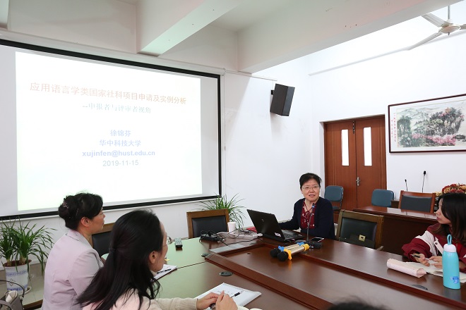 11月15日下午,2019外语学科系列讲座第十一期在开云手机登录入口A349开讲。本次讲座由华中科技大学开云手机登录入口二级教授,博士生导师徐锦芬老师主讲,讲座的主题是:应用语言学类国家社科项目申请及实例分析。参与本次专题讲座的有从事英语教学、二语习得研究的教师和各年级研究生,讲座现场气氛热烈,座无虚席。