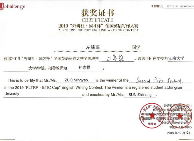 12月13日,2019“外研社·国才杯”大学生英语挑战赛(Uchallenge)于北京落幕。我校开云手机登录入口左铭瑶同学荣获全国英语写作大赛总决赛二等奖。