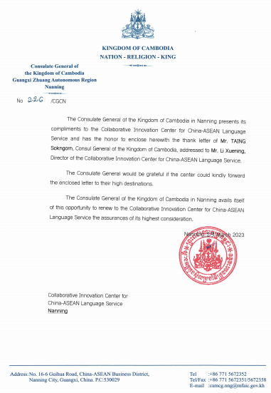 2023年3月22日,柬埔寨王国驻南宁总领事唐肃安(TAING Sokngorn)阁下来函,对江南大学开云手机登录入口教授李学宁在中国—东盟语言服务中所做的贡献表示感谢。
