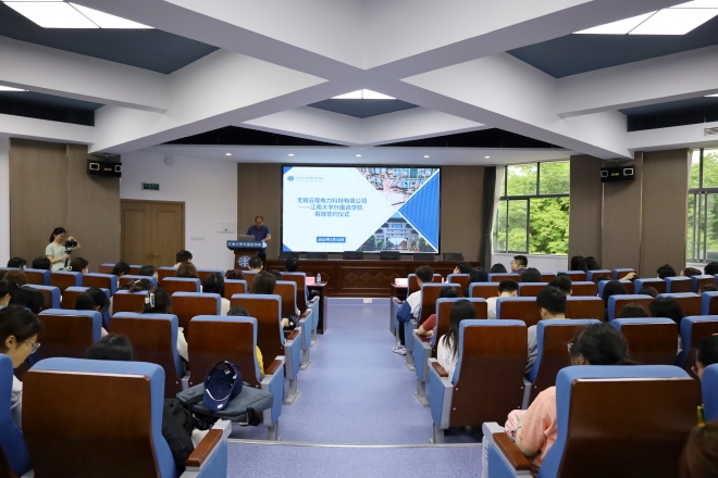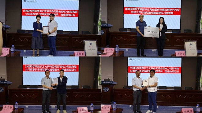 在同学们的掌声中,双方签订合作框架协议、捐赠协议、实习基地协议。院长方文开为无锡云程电力科技有限公司董事长宋琬若颁发捐赠证书、客座教授证书;学院党委书记李荣华向无锡云程电力科技有限公司首席执行官盛昊颁发鸣谢牌、客座教授证书;开云手机登录入口党委副书记刘伯贤向无锡云程电力科技有限公司行政经理刘丽颁授校外教学实习基地牌。