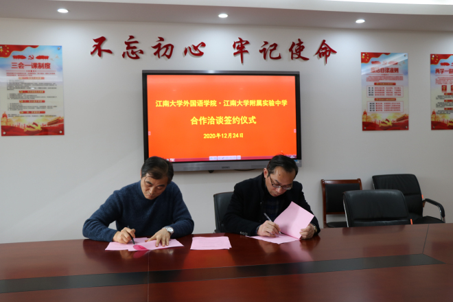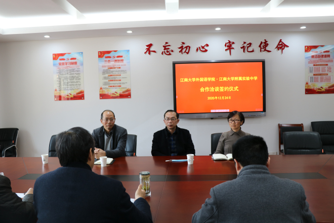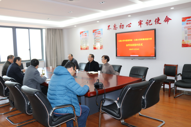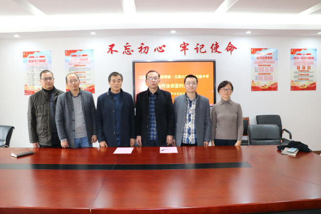 12月24日下午3:30,我院与江南大学附属实验中学共建学生实习基地签约仪式在江南大学附属实验中学六楼会议室举行。学院院长方文开、党委副书记刘伯贤、副院长顾琦一、附属实验中学校长吴卫东、校党总支书记王星、副校长陈柏林参加了签约仪式。