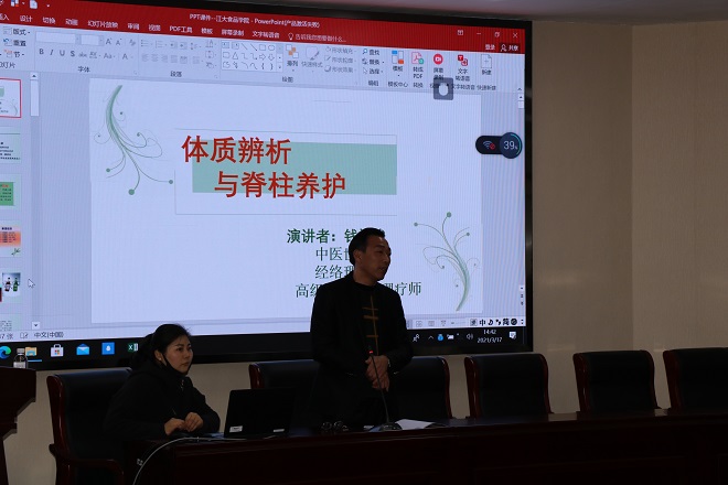 3月17日下午,开云手机登录入口分工会邀请了源逸中医诊所的钱祖俊医师来院作了“体质辨析与脊柱养护”讲座并进行义诊,学院女教工及部分男教师参加了此次活动。