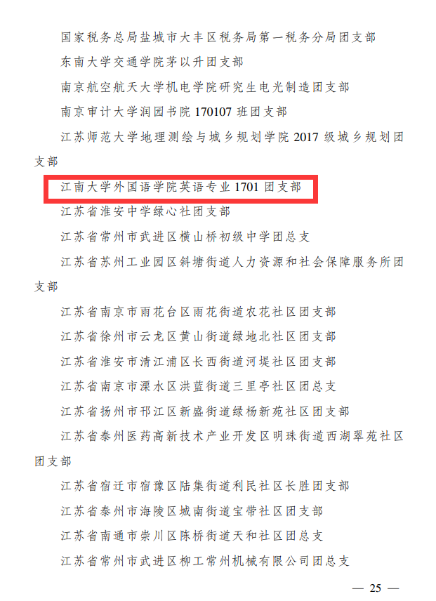 英语1701团支部秉持“团结向上、拼搏进取、爱国奉献”的精神理念,持续推进“班团一体化”建设,增强支部凝聚力、提升支部活跃度,曾获“无锡市五四红旗团支部”、“江苏省先进班集体”等荣誉称号。强化思想引领,凝聚青春力量。创新规范开展“三会两制一课”,全年举办“向逆行者致敬”主题教育活动、战“疫”云演讲系列“信仰公开课”等12次。团支部团员100%参与疫情防控工作,参与编译的无锡版《新冠防护指南》为在锡外籍人士提供及时专业的指导,受到无锡市外事办的感谢和表扬。励学筑牢根基,厚积铸就卓越。团支部学风优良,英语专业四级考试通过率全院第一,成功保研中国人民大学、哈尔滨工业大学等6人,人数位列全院第一。支部成员在外语类学科竞赛中屡创佳绩,共获4项国家级奖项,6项省级奖项。梦想铭记于心,志愿服务于行。支部成员累计服务世界跆拳道锦标赛、中俄创新创业大赛等重大赛事26场次,提供服务超642小时,先后获评志愿证书108张。