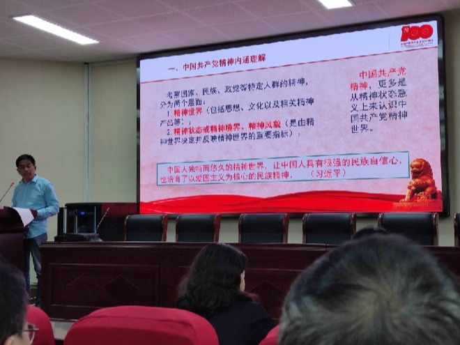 徐锡清以《中国共产党精神谱系》为题,分中国共产党精神内涵理解、中国共产党精神主体分析、中国共产党精神谱系构架三个部分,深入浅出地分析了中国共产党精神谱系的核心内涵,讲述了由中国共产党的领袖人物、各级组织及成员、人民军队、人民群众和其他政治力量组成的多样化的精神主体,如何在革命阶段、建设阶段、改革开放阶段和新时代阶段,用时百年培育形成了内涵丰富、形态纷繁的精神谱系。他总结到,在中国共产党迎来建党百年之际,学习和认识中国共产党精神谱系,是为了寻根求本,增强红色基因认同和伟大党史认同,永葆共产党人的政治本色,弘扬光荣传统和优良作风,以更加奋发有为的精神状态,开拓党和国家事业的光明未来。宣讲受到学院教职工的热烈欢迎。