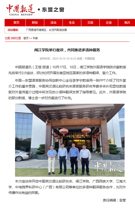 本次座谈将开启中国英汉语比较研究会、闽江学院、广西民族大学、江南大学、中培跨界科研中心(广西)有限公司等单位的多语种翻译服务合作,为对外传播作出有益的探索。中国外文局亚太传播中心中国报道网报道了座谈会相关情况。