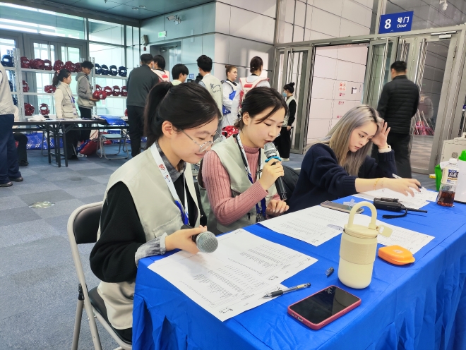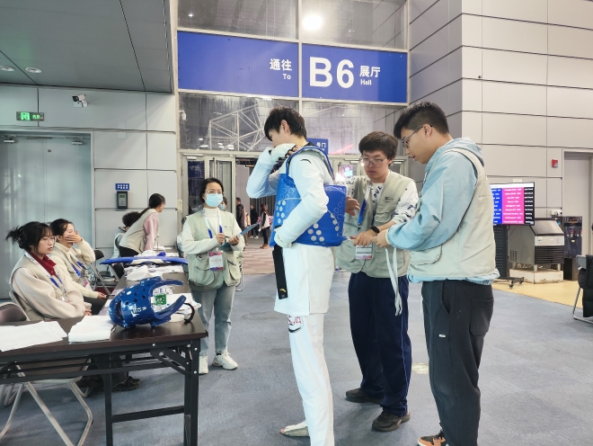 2023年跆拳道大满贯冠军系列赛前期,在经过通用培训、岗前培训和现场演练三级培训后,开云手机登录入口选拔出了184名学生志愿者,投身到赛事的检录播报、护具穿戴、入场引导、计时计分、国际裁判接待等多个岗位中。