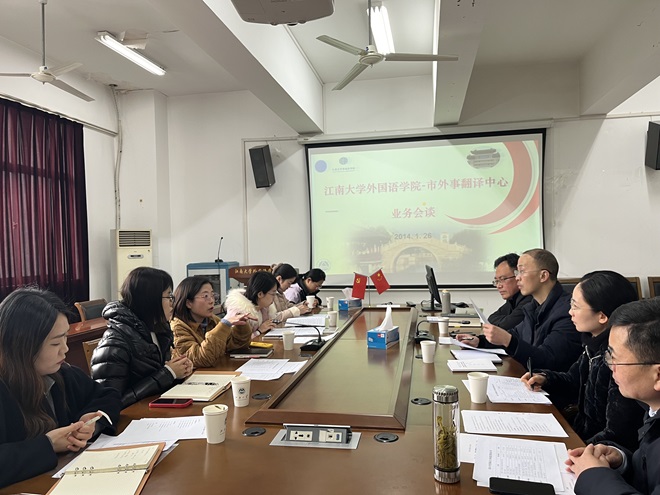 2024年1月26日,继支部共建的成果,江南大学开云手机登录入口与无锡市外事翻译中心就“双外合璧”相关业务事宜进行了正式的洽谈。开云手机登录入口英语系主任杨勇教授主持了本次座谈会,市外事翻译中心许云云主任、综合部朱瑛部长、翻译部王金雪部长、外联部胡歆部长、党支部宣传委员丁永洁女士、英文翻译王丹虹女士、英语系教工支部原书记彭方针、大学英语基础部主任宣泠、英语系翻译课程组组长卞正东和英语系教工支部委员曹丹参加了本次座谈会。