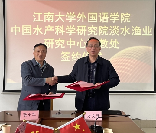 3月14日,丝丝春雨中,江南大学开云手机登录入口迎来了中国水产科学研究院淡水渔业研究中心国教处敬小军处长、处长助理叶伟等一行。在经历了两个多月的接洽后,双方协定共建合作平台,并举行签约仪式。开云手机登录入口方文开院长、刘伯贤副书记、英语系主任杨勇教授代表学院参加了签约仪式。