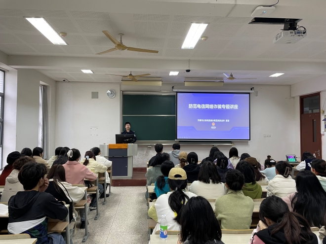 雪浪派出所董蕾警官围绕“电信诈骗定义”、“典型案例”、“如何防范”等方面进行介绍分享。董蕾展示了一系列典型诈骗案例,强调诈骗“无孔不入,无处不在,大家要提高警惕”。其次,董蕾提醒同学们下载“国家反诈中心APP”,打开“来电预警”功能,才能有效进行诈骗预警劝阻。此外,董蕾还强调,同学们要防范兼职刷单、杀猪盘、办理贷款、投资理财、冒充购物客服退款、买卖游戏装备等诈骗手段,并介绍诈骗犯罪的作案规律,提醒同学们提高电信网络诈骗意识和能力,告知同学们甄别办法,进一步增强“辨识力”。讲座结束后,同学们也结合现实经历进行提问交流。