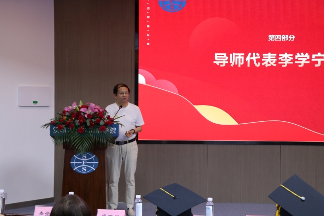 导师代表李学宁教授通过风趣幽默的语言分享了三个故事,表达了对同学们的美好祝福和殷切期望。李学宁表示:是爱将他和大家聚在一起,三年相处中,从认识大家到熟悉大家再到欣赏大家,他为有这份师生缘分而感到幸福。