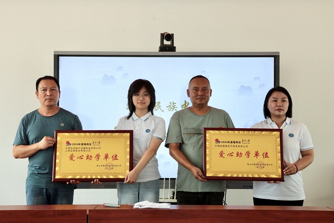 芒宽民族中学校长茄学平及副校长李文清为爱心企业家代表周小丽、杨田欣授牌。在爱心企业家们对教育事业发展的帮助下,学校教学条件逐步改善,教学质量将稳步提升,为培养更多优秀人才奠定坚实基础。
