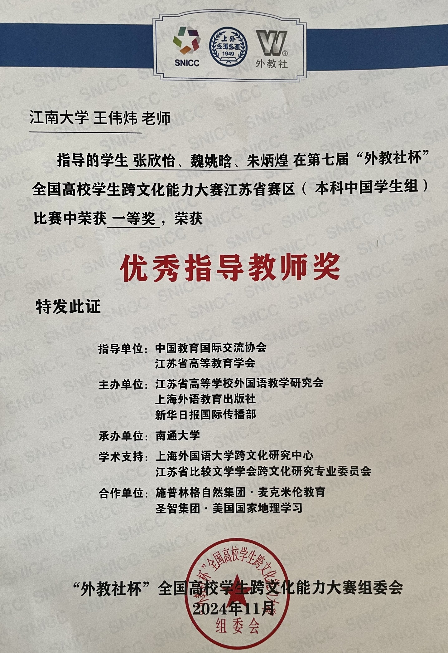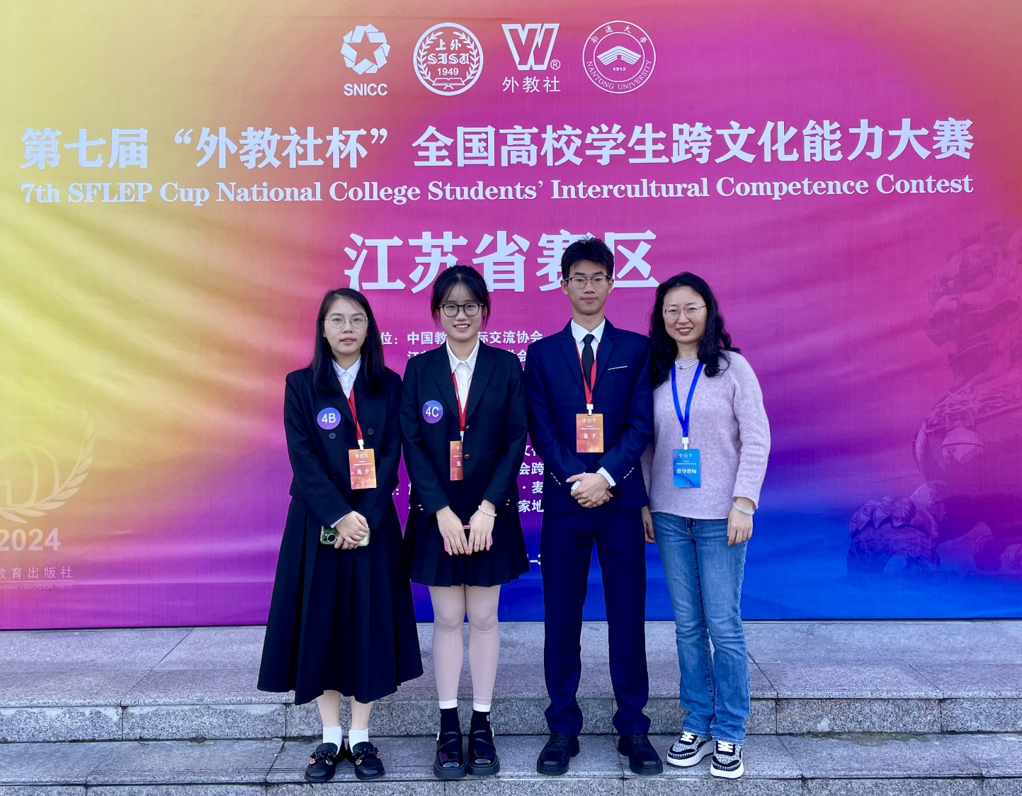 2024年11月1日至3日,第七届“外教社杯”全国高校学生跨文化能力大赛江苏省赛区比赛在南通大学成功举办。比赛分为本科中国学生组、高职中国学生组和国际学生组三个赛道,其中本科中国学生组共有包括来自南京大学、东南大学、南京理工大学、南京医科大学等43所高校的43个团队。经过激烈角逐,由我校开云手机登录入口张欣怡、人文学院魏姚晗和生物工程学院朱炳煌组成的团队在指导老师王伟炜的带领下顺利晋级江苏省赛区决赛并最终荣获江苏省赛区一等奖。这是我校学子在此项比赛中继去年荣获省赛一等奖后的再次丰收。
